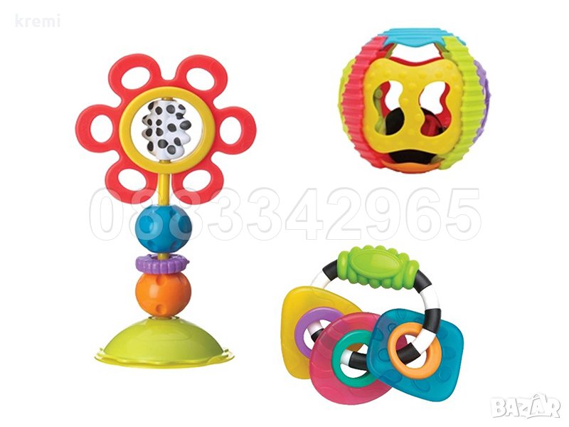 Подаръчният комплект дрънкалки на австрийската фирма Playgro се състои от 3 играчки, спомагащи за развитието и успокояване на възпалените венци.