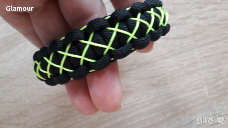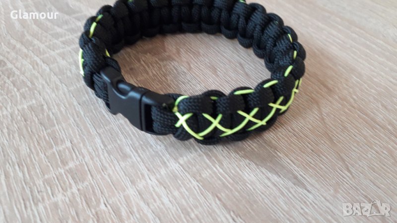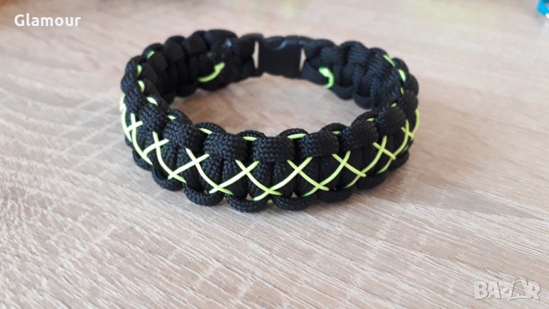 Гривна от паракорд(парашутно въже) .За обиколка около 19.5/20 см.,ширина около 2 см.Цвят черен с електриково зелено,което не може да се види толкова ярко на снимките.