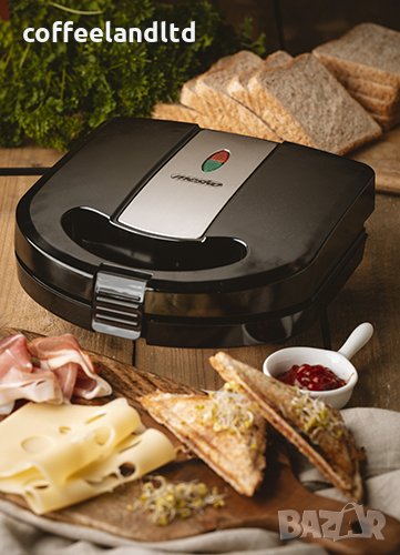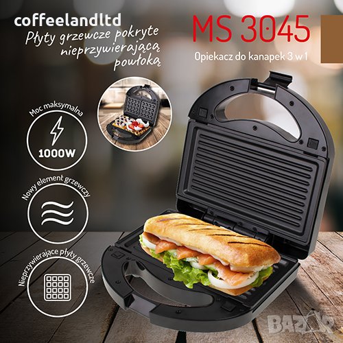 Практичен тостер 3в1 с максимална мощност 1000W. Благодарение на сменяемите три нагревателни плочи, устройството ви позволява да приготвяте хрупкави гофрети, вкусни сандвичи, зеленчуци или месо на скара. Специалното покритие върху нагревателните плочи предотвратява залепването, което прави устройството лесно за почистване. Термостатът сигнализира за достатъчно нагряване на плочите и осигурява правилната температура през целия процес на препичане. Благодарение на това приготвените продукти са хрупкави и златисти.