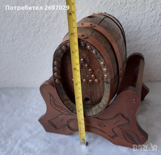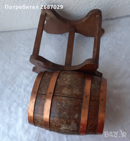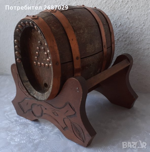 дървено буре бъкел буренце бъчва бъчвичка с медни обръчи и стойка с дърворезба