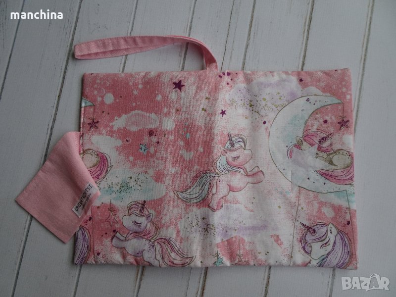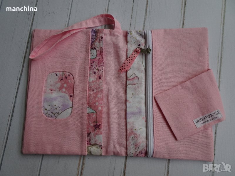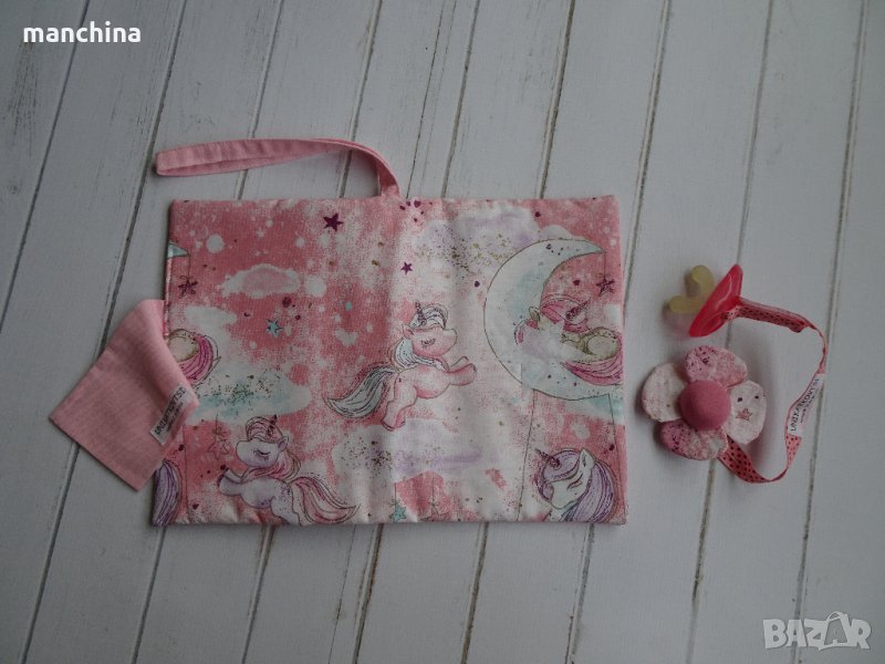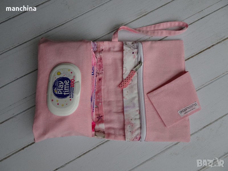 Органайзер с 4 отделения- 1 за мокри кърпи, 2 за пелени/памперси и 1 с цип за по-дребни необходимости по време на разходка. Има удобна дръжка за носене. Изработен от памучни платове, подплатен с вата.