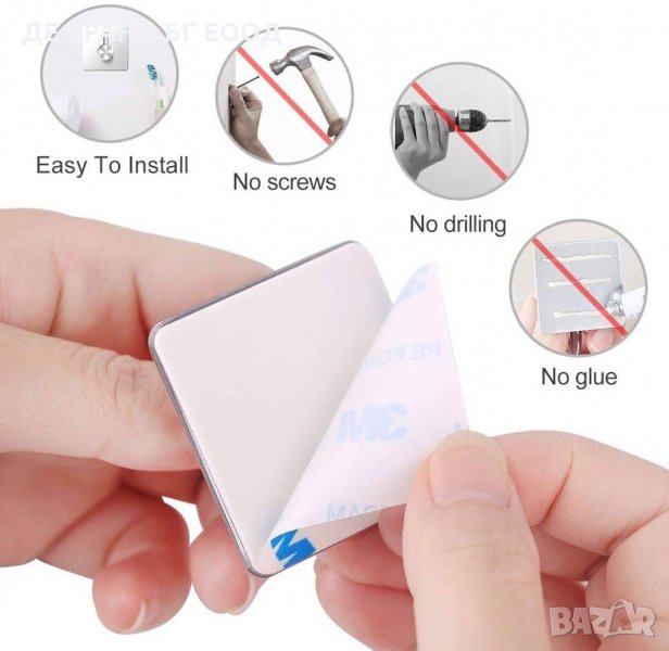 Фиксацията е изключително лесна и не изисква пробиване на стената или плочките, тъй като се прикрепят чрез залепяне, което не оставя следи по повърхността след евентуално премахване на стойката и закачалката.