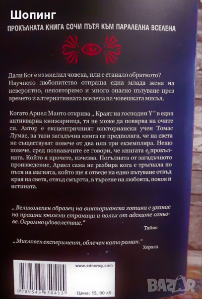 Дали Бог е измислил човека, или е станало обратното? Научното любопитство отпраща една млада жена на невероятно, неповторимо и много опасно пътуване през времето и алтернативната вселена на човешката мисъл. Когато Ариел Манто открива “Краят на господин Y” в една антикварна книжарница, тя не може да повярва на очите си. Автор е ексцентричният викториански учен Томас Лумас, за тази загадъчна книга се предполага, че на света не съществуват повече от два или три екземпляра. Нещо повече, сред познавачите се говори, че книгата е прокълната. Който я прочете, изчезва. Погълната от загадъчното произведение, Ариел сама не разбира кога е тръгнала по пътя на магията, който ще я отведе на едно пътуване отвъд края на света, отвъд смъртта, в търсене на любовта, покоя и истината. “Великолепен образец на викторианска готика с ухание на прашни книжни страници и полъх от адските огньове. Огромно удоволствие.” Таймс, “Мисловен експеримент, облечен като роман.” Хералд Представяне тук: