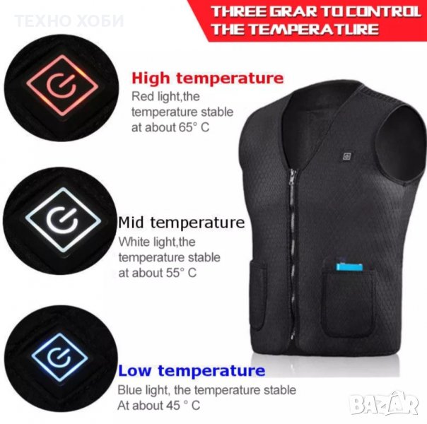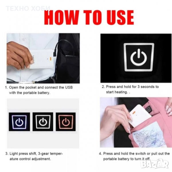 Задръжте бутона в предната горна лява част на елека в продължение на 3-5 секунди. Има 3 степени на затопляне: