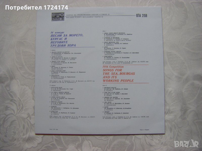 Грамофонна плоча - ВТА 2159 - IV конкурс "Песни за морето, Бургас и неговите трудови хора"