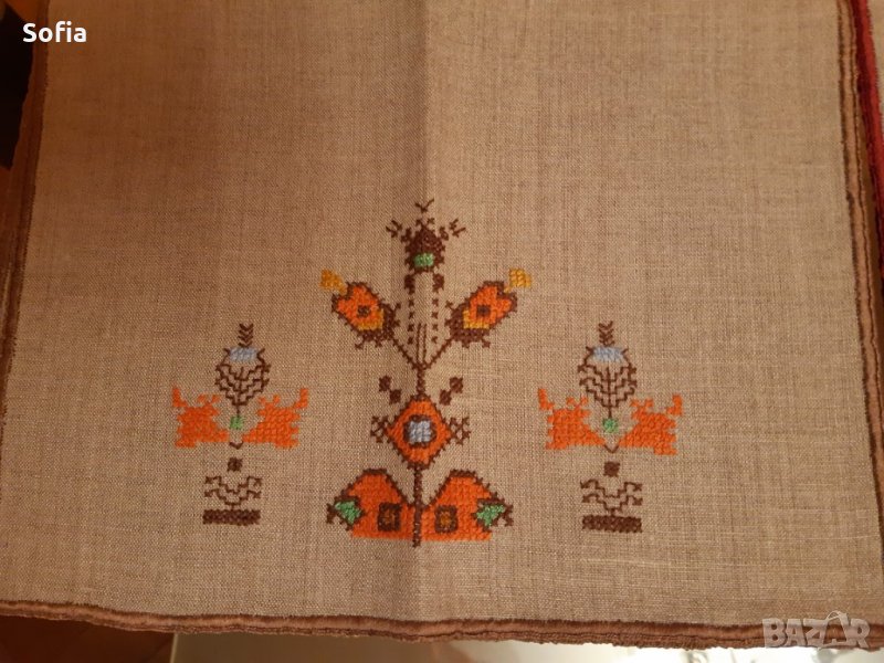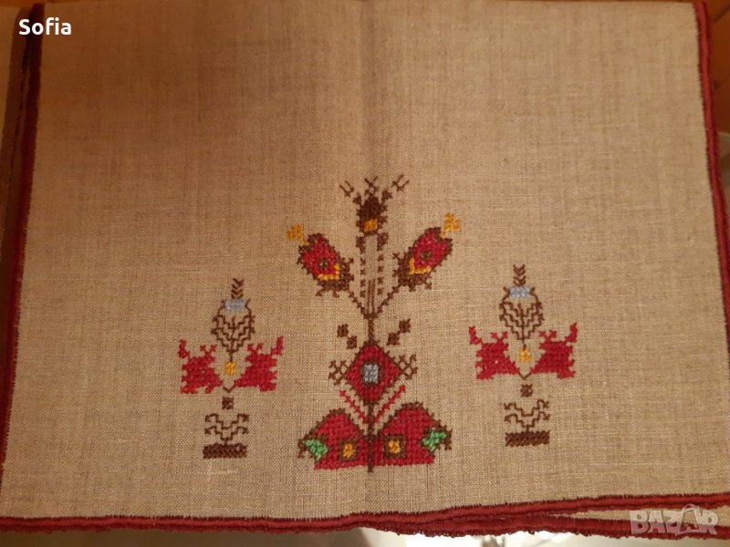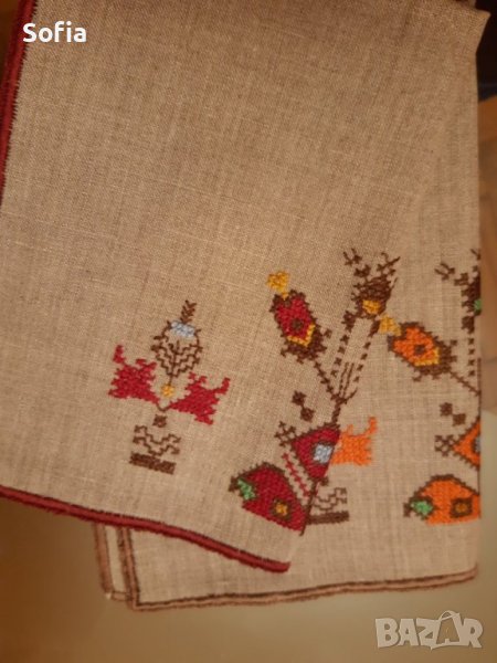 Покривката е ръчна изработка с бродерия изпълнена със Сингер стара крачна машина.Рязана бродерия върху ленена панама.