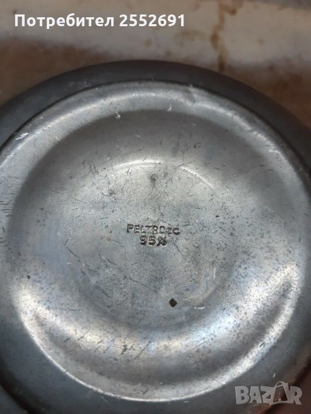 Старинен, метален съд смаркировка. "PELTRO cc 95% " Добре запазен. Височина 7см. Диаметър- 12,5см.