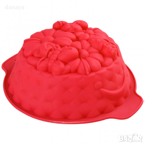 Силиконова форма за печене Полянка с маргаритки и кацнали пчеличка, пеперудка и калинка върху тях. Силиконова форма за кекс или други сладкиши с нестандартна форма. Незалепващо покритие.