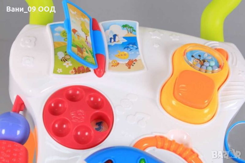 играчка, улесняваща прохождането на малките деца. Функции: четири клавиша с ноти (do, re, mi, fa), забавни мелодийки, свирене с клавиши по зададена от системата мелодийка, музика, книжка за прелистване, телефонна шайбичка с щракащ звук, огледалце, въртящи се елементи, магическа дъска с включено вълшебно моливче (пишете и изтривайте до безкрай), светещи елементи. Пианото, телефонната слушалка и магическата дъска се отделят от играчката и може да се играе самостоятелно с тях. Преди употреба премахнете защитното фолио от огледалцето! Заредете с пианото с 2 батерии от 1.5 V size AA. Размери на проходилката-32*42*45 см. За деца над 6 месеца.