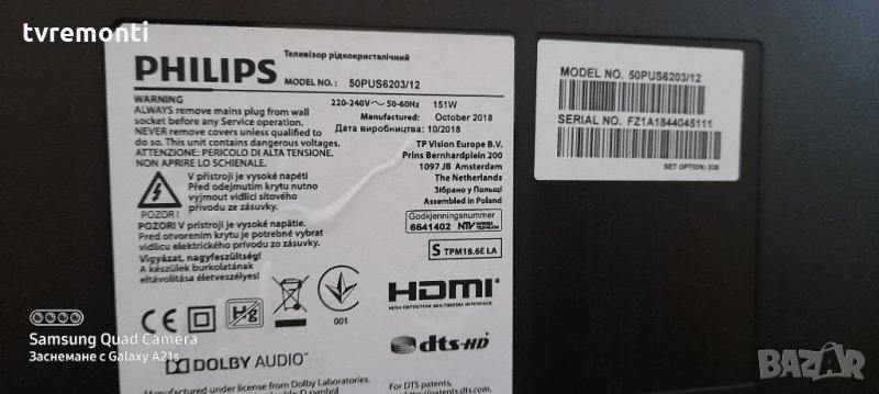 PHILIPS 50PUS6203/12, борда е гарантирано работещ Демонтиран от Телевизор PHILIPS 50PUS6203/12 със счупен дисплей TPT500B5-U1T01D rev.S01R тесвана от нашия техник