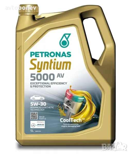 SYNTIUM 5000 AV е напълно синтетично двигателно масло с ниско пепелно съдържание. Произведено с технологии разработени за Формула 1. Уникалната технология °CoolTech™ осигурява надежден поток на маслото при екстремно високи температури, там където двигателя е най-натоварен. Специалните присадки гарантират устойчиво смазване при най-натоварените компоненти на двигателя, като отвеждат топлината. Свойствата му спомагат за оптимизиране работата на двигателя и намаляване на разхода на гориво. Притежава висока степен на защита както при ниски така и при високи температури. Осигурява ниско количество на отлагания в изпускателната система. Подходящо е за двигатели снабдени с филтри за твърди частици DPF и трипътни катализатори TWC. Покрива изискванията на съвремените бензинови и дизелови двигатели. Предназначено за двигатели изискващи масла с удължен междусменен интервал. SYNTIUM 5000 AV e масло специално разработено за да покрие изискванията на съвремените двигатели на VW и Mercedes Benz. SAE 5W30;