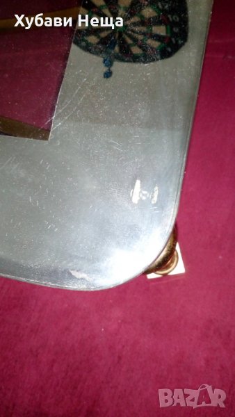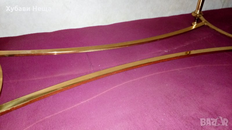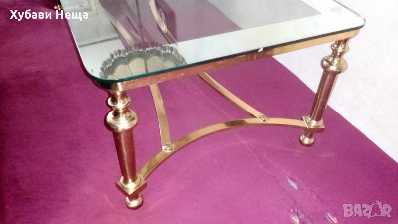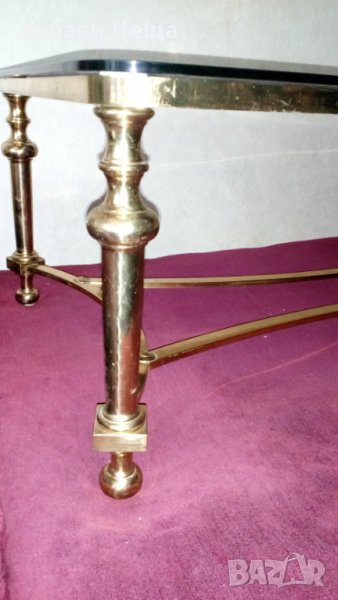 Масичката е изработена от месинг с стъклен плот. По ръба на стъклото има огледална повърхност. Широка 8 см. На места има драскотини, показани на снимката. Теглото на месинга в масичката е 10 кг. Дъл жина 119 см. Широчина 61 см. Височина 40 см. Материала на масичката струва 50лв. Поцени на вторични