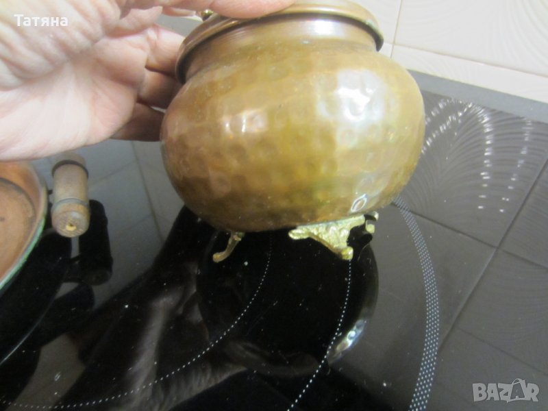 ЗАХАРНИЦА височина 13 и диаметър -8см,месингови крачета месингови орнаменти върху капачето на захарницата.Цена 28 €