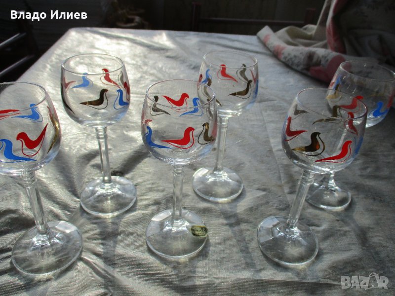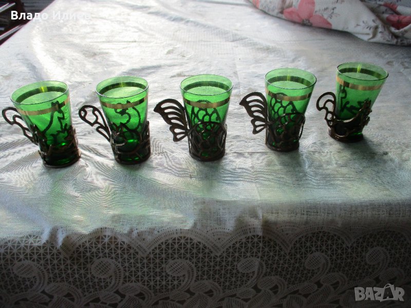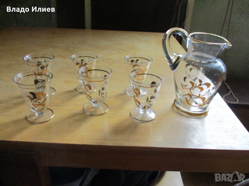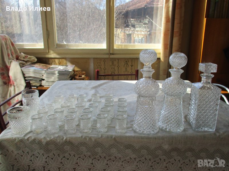 Сервизите са разнообразни.Има чехословашки между тях-съвсем нов,оригинален,производство на "Бохемия"-вижте етикета.Също и руски сервиз-с метални поставки във формата на животни.Също неизползван.Към някои има канички и бутилки за ракията.Единият е керамичен-кафявият.Снимал съм и етикетите ,които са запазени-доказателство,че сервизите са нови.