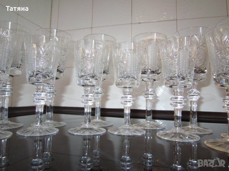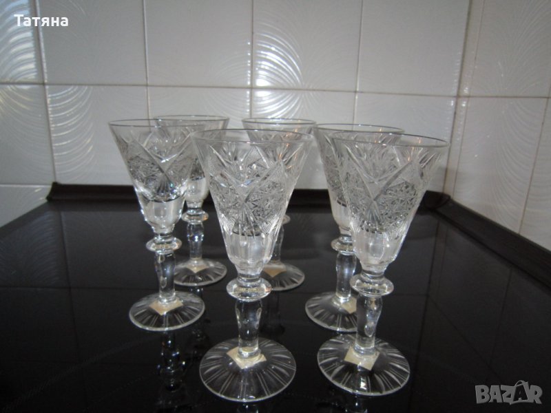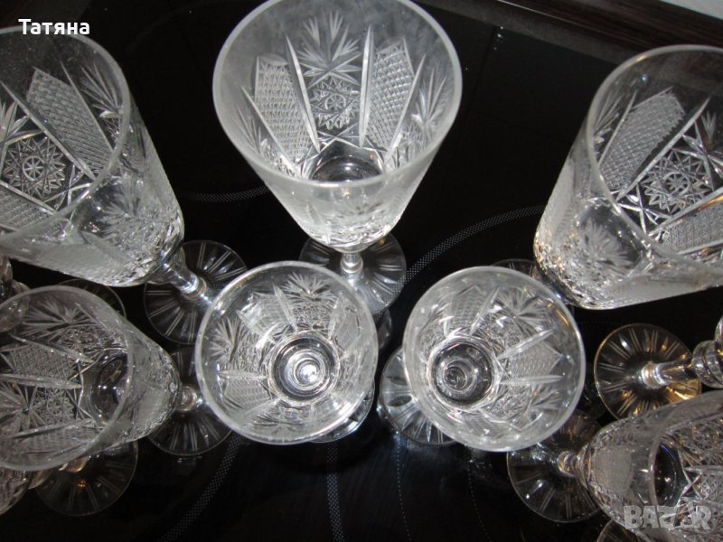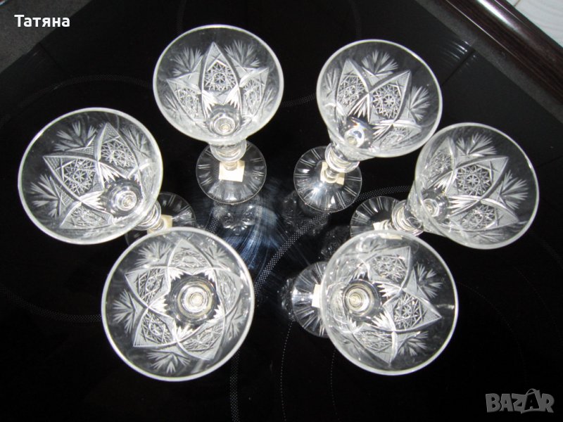 - 6бр.Моделите са от един и същи вид,но първите 6бр са за вино,а другите 6 бр са за концентрат и са с различни размери/на снимките трудно могат да да се различат като размер/Всички комплекти са от оловен кристал.НАЛИЧЕН е само комплекта за водка,ракия/5см -диаметър и височина -13,5см./На снимките са на предната линия
