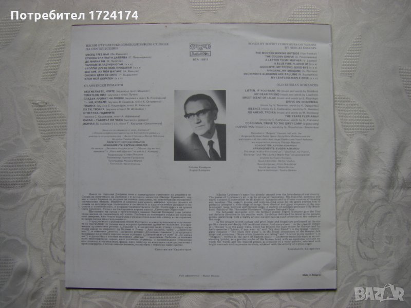 Аранжименти Евгени Комаров; с участието на Оперно-симфоничен оркестър на Българското радио, цигулково дуо Ангел Станков и Йосиф Радионов; съпровождат на пиано Теодор Мусев и Евгени Комаров