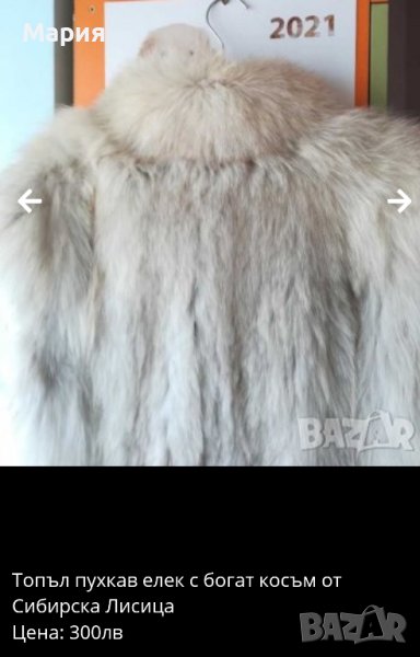 Елека е нов без забележки, но е без етикет! Много богат и пухкав косъм от Сибирска бяла Лисица! В талията има ластик и копчета с който може да се вталява още при необходимост! Стои втален като модел! Невероятен модел и косъм! Отговаря на номер Л. Ако имате въпроси може да питате чрез сайта на лично съобщение. За качеството смятам че цената е много добра. В магазините са по 460 лв такъв вид елеци и дори може да попаднете на китайски елек. Този елек е много по - добро качество. На живо се вижда косъма още по - хубав и пухкав! Невероятен подарък за всяка дама!
