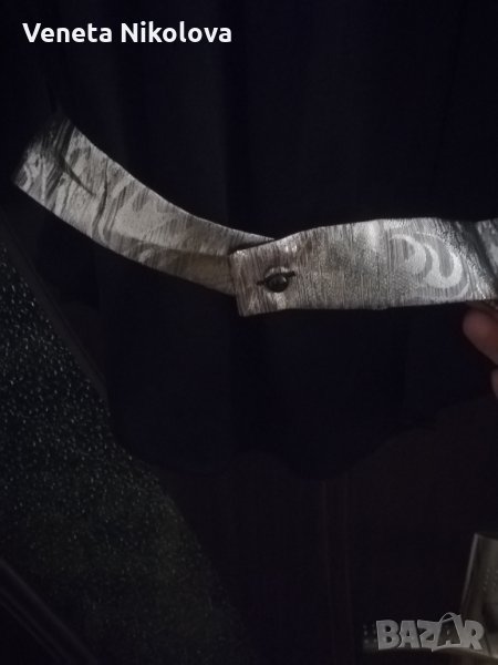 Дамска блуза 100%полиестер, 3/4 ръкав с манжет с копче, с лъскави гарнитури и подвижен колан, с подплънки. Колана се регулира с две степени.