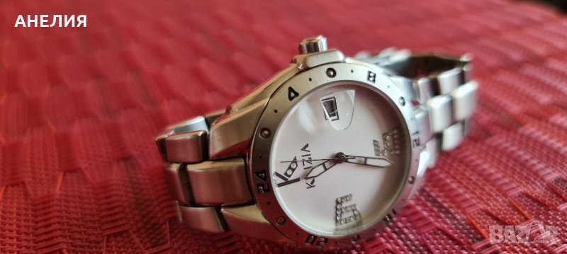Дизайнерски италиански часовник Krizia, класическа изчистена линия, кварц, изключително качество на механизма, ненадраскваемо сапфирено стъкло, циферблат с датник и лупа, инкрустирани полускъпоценни камъчета, водоустойчив, каишка на сегменти от благородна стомана- тип гривна, с възможност за персонализация. В перфектно състояние.