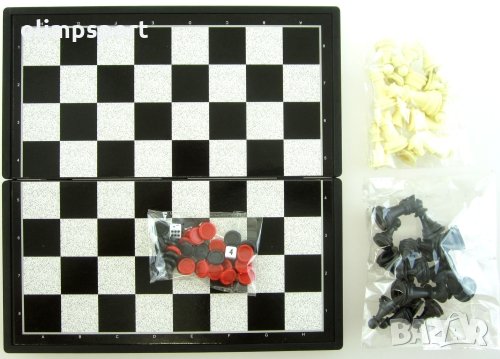 Комплект 3 в 1 класически настолни игри - шах, дама и табла. Комплектът е много удобен при пътувания и игра на открито. Комплектът съдържа: Игрално поле - кутия, шахматни фигури с размери от 2.5 до 5 см, пулове с диаметър 1 см и зарчета.