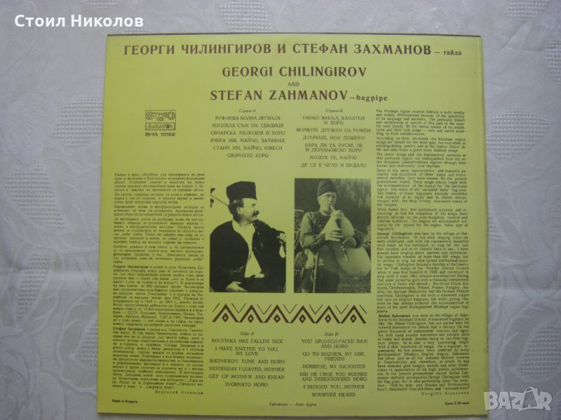 Грамофонна плоча - ВНА 10162 - Изпълнения на Георги Чилингиров и Стефан Захманов - гайда