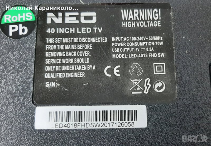 Продавам тв NEO LED-4018 FHD SW за части по причина-счупена матрица/ CX400DLEDM/.Редовни съответно: