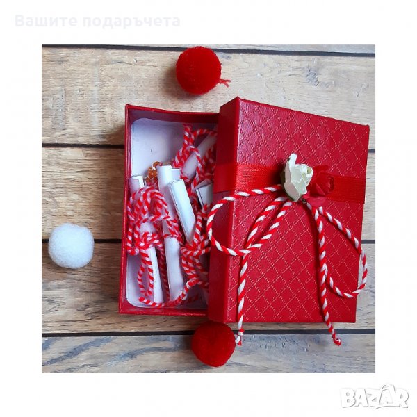 2. Червена кутия с 8 бр. пожелания, вързани с мартеничка за ръка