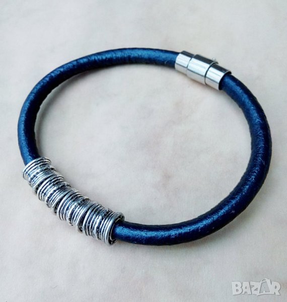 5 мм синя кожена връв, 4 мъниста тибетско сребро (8х12 мм), магнитна закопчалка със заключаващ механизъм. Дължина 22 см.