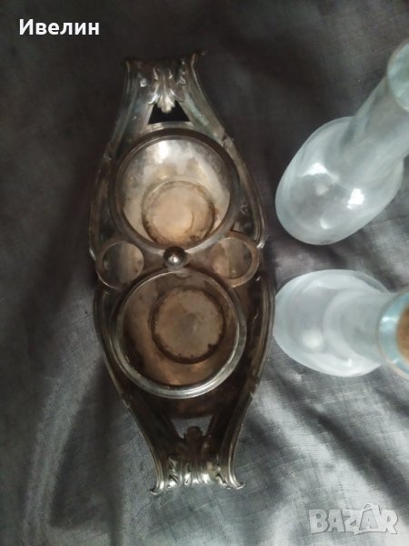стар оливерник арт деко.посребрен метален корпус с размери 22см/10см,отвор за шишетата 5см.налична маркировка.внос от франция.