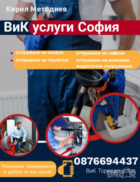 Денонощни ВиК услуги на територията на град София. Откриване и отстраняване на течове и аварии. Отпушване на мивки, сифони, канали, душ кабини, вани, водостоци, улуци и др.