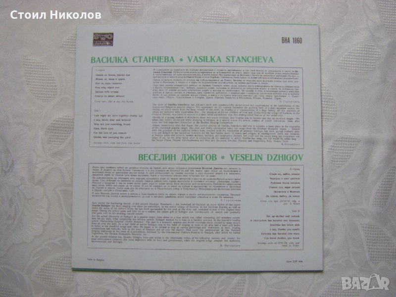 Грамофонна плоча- ВНА 1860 - Изпълнение на Василка Станчева и Веселин Джигов
