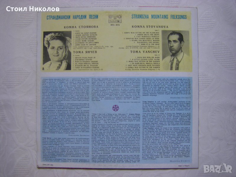 Грамофонна плоча - ВНА 2074 - Странджански народни песни изпълняват Комна Стоянова и Тома Янчев