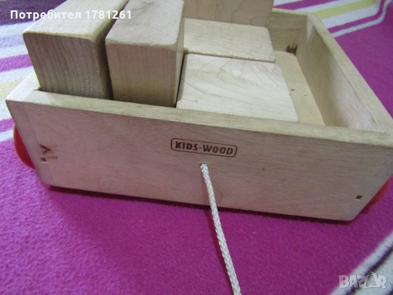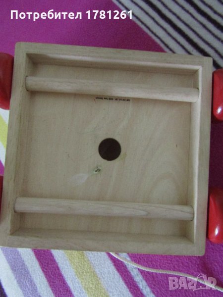Голяма, масивна количка от дърво. В отлично състояние. Има въженце за дърпане. 21 см, на 21 см.