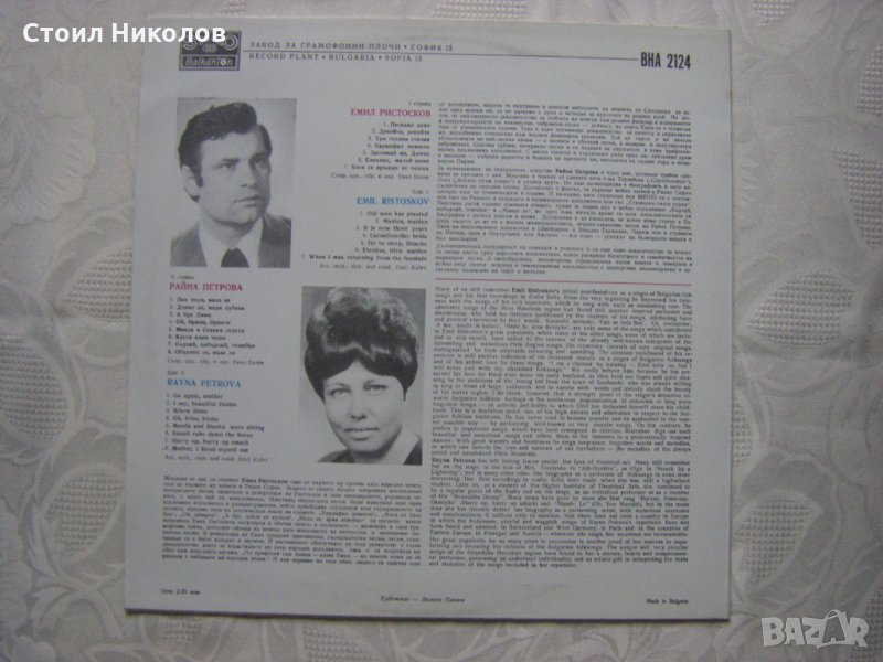 Грамофонна плоча - ВНА 2124 - Пирински и Странджански народни песни изпълняват Емил Ристосков и Райна Петрова