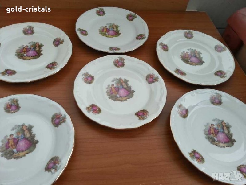 Стар български порцелан изида барок Ромео и Жулиета златен кант предястие 18см 6бр-120лв за основно 23см 6бр-149лв големи дълбоки 23см 6 бр-130лв малки дълбоки 19см 6 броя -120лв без забележки сервиз комплект сет лот ретро арт декор винтидж колекция стар старинен антикварни предмети обзавеждане за дома и семейството подходящи за подарък за ценители и колекционери