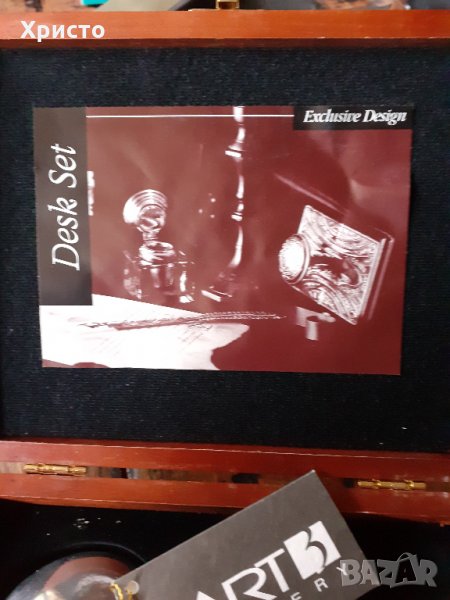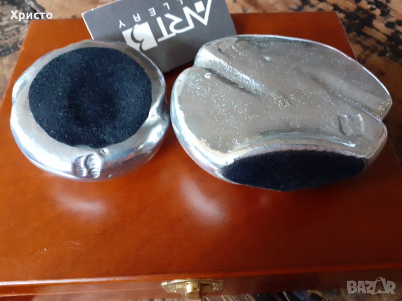 преспапие дизайнерски ръчна изработка, антикварен уникат, АRT GALLERY, произведен ръчно от дизайнери в Испания, масивни и доста тежки, месинг и тежък алуминий, сменена батерия на часовника, работи перфектно. Внесен в България през 2004 година. За колекционери и ценители на красивите вещи. В луксозна кутия от естествено дърво с размер 21х17х5 см. Авторски щемпел на художника.