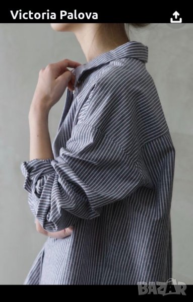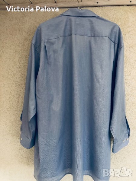 Ризата е огромна,рамо-57-58см,ГО-74см,дължина-83-84см,ръкав от рамо-52см,от мишница-42см.материята е много тънка,и тъй като ризата е огромна-жените могат да я стилизират за лято било за кежуал,било за плаж-хипертрофирано големи ризи са тренд тази година.
