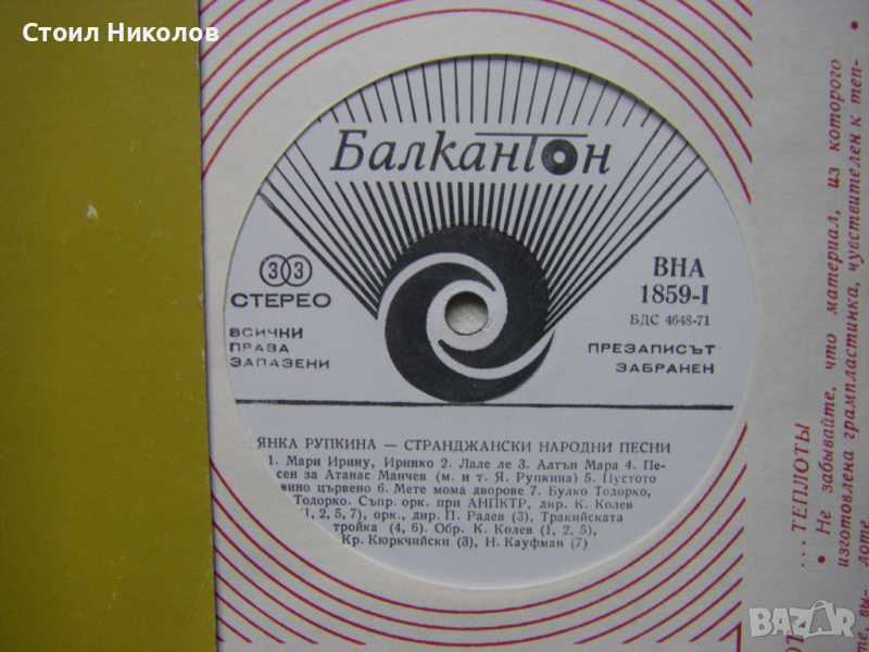 Грамофонна плоча - ВНА 1859 - Янка Рупкина - Странджански народни песни