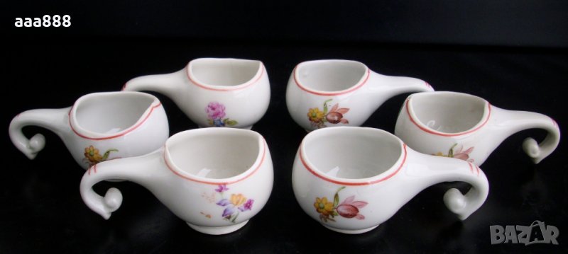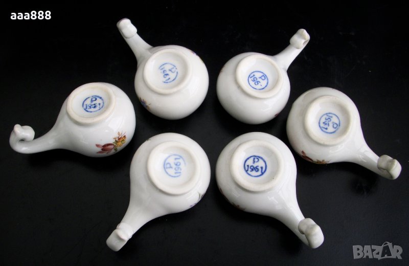 Чашките са с форма на кратунки, 6 броя, миниатюрни, с глазиран кант, двустранно декорирани с различни флорални мотиви. Фабрично маркирани с "Р 1961".