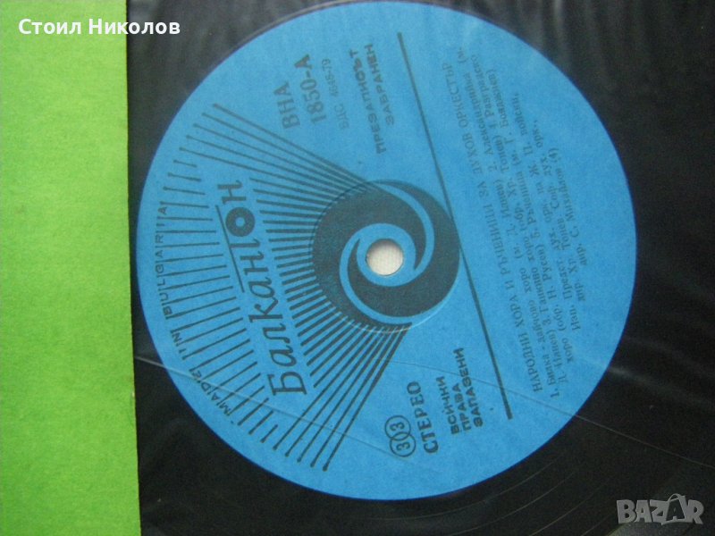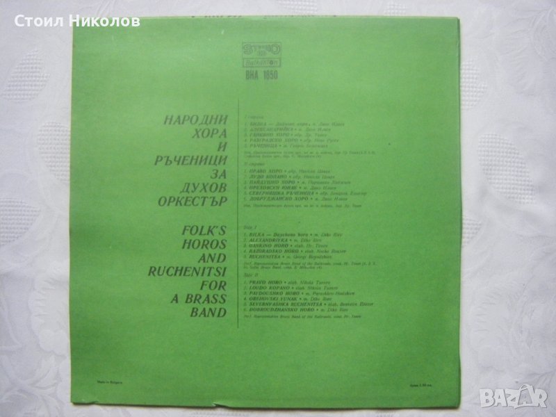 Грамофонна плоча - ВНА 1850 - Народни хора и ръченици за духов оркестър. Изпълняват Представителен духов оркестър на ж.п. войски, диригент Христо Тонев и Софийски духов оркестър, диригент Сашо Михайлов