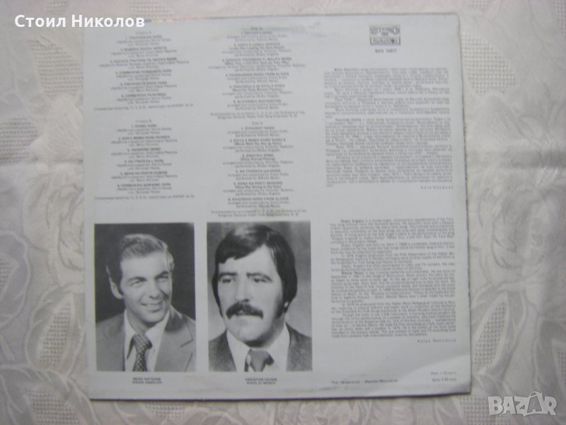 Изпълнява Жеко Ангелов - цигулка (2, 3, 5) и Н. Ненов - цигулка (1, 4, 6); съпровожда оркестър (1, 2, 3, 5) и Оркестър при Ансамбъл за народни песни при Българското радио (4, 6), обработка Коста Колев (1, 4, 6), Христофор Раданов (2, 3, 5), диригенти Коста Колев (1, 4, 6) и Христофор Раданов (2, 3, 5)