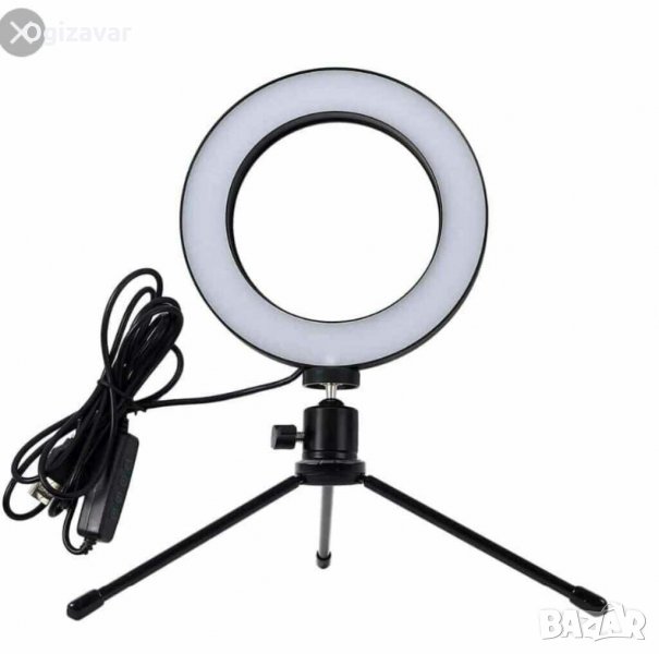 LED лампа-ринг за заснемане на видео или фото, тази лампа като осветяване отговаря на изискванията за поток светлина на повечето заснемания на видео или фото заснемане подходящи за качване в интернет пространството селфи снимки или видео за YouTube. LED кръговата светлина за снимки и видео се предлага с регулируема стойка-трипод. Стойката е изработена от алуминиева сплав, което й придава голяма здравина. Разтегаемият дизайн-разкрачването улеснява поставянето на стойката на различни терени. 16 сантиметровия светодиоден ореол върху стойката има малък пулт за управление. Захранващия кабел е с дължина 2 метра. Селфи кръга има 46 броя LED диоди, може да регулирате светлинния поток от най-светло до тъмно бутон от пулта за управление. Можете да настроите светлинните условия, за да постигнете голямо разнообразие от тонове на кожата, за да отговарят на вашите нужди за перфектна снимка или видео. Този селфи ринг за снимки и видео може да осигури осветление от студено бяло до топло бяло (3500K / 6000K). Тази функция се командва също от пулта за управление. Ринга черпи ток и се включва в повечето устройства, които поддържат USB порт, като лаптоп, компютър, Power Bank за захранване, USB зарядно, променливотоков адаптер и др. Тегло на комплекта: 380 гр.