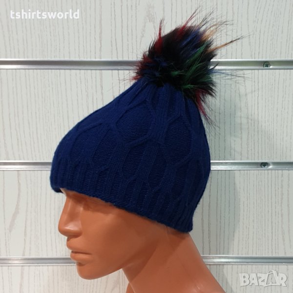Нова зимна дамска тъмносиня шапка с шарен помпон/пух → Обява 31664861