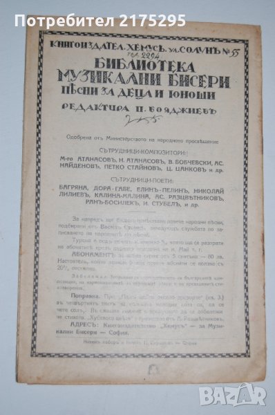 Антикварна нотна книжка- песнопойка от сборника "Библиотека музикални бисери - песни за деца и юноши"- редактор Петър Бояджиев издание 1930 г, издателство Хемус.Книжката е част от сборник от10 книжки.