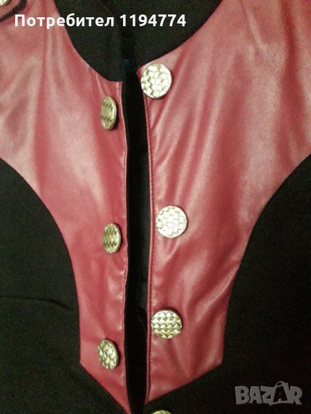 Дамско ефектно сако. Еластична плътна материя и комбинация от кожа в предната част. Закопчаване с телени копчета тип кукички. Слагано е само веднъж и е неразличимо от ново.