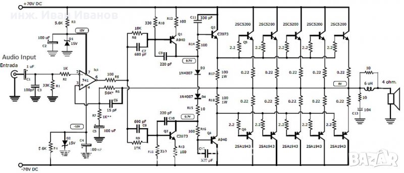 На последната снимка е даден 1000W Stereo Audio Amplifier with Transistors 2SC5200 and 2SA1943