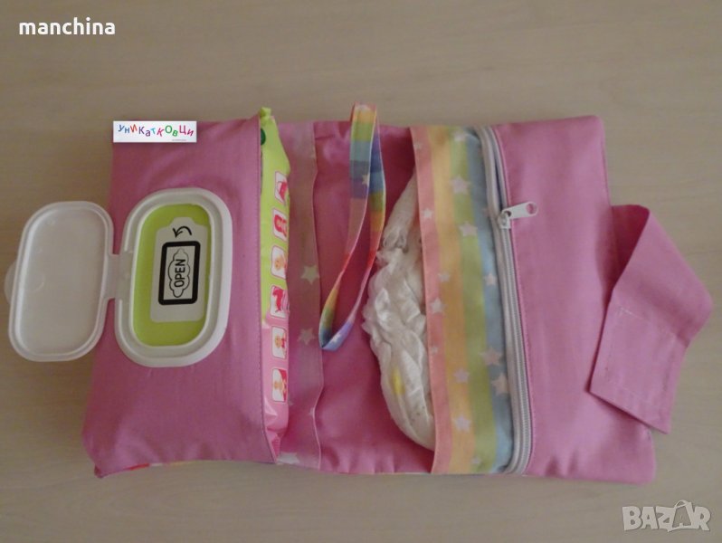 Органайзер с 4 отделения- 1 за мокри кърпи, 2 за пелени/памперси и 1 с цип за по-дребни необходимости по време на разходка. Има удобна дръжка за носене. Изработен от памучни платове, подплатен с вата.