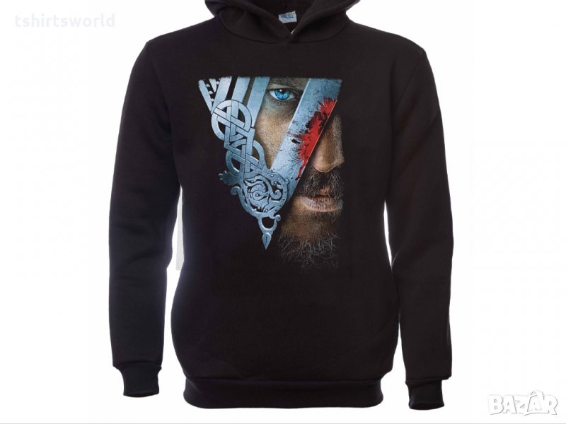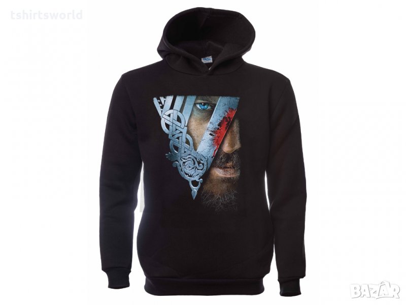 Страхотен нов мъжки суичър в черен цвят с качулка, две джобчета и дигитален печат на сериала Викинги. Произведен в България под марката PRINTEX от висококачествен 100% памук - триконечна пенирана вата с кардировка, което го прави изключително топъл и желан от нашите дългогодишни клиенти. Моделът е подходящ за пролетния и есенно-зимният сезон, има ластични маншети на китките и ханша, запазващи топлината. Разполага с мека подплата и два отворени джоба в страни. Свободната кройка го прави подходящ както за спорт, така и за ежедневно носене с дънкови панталони. Марката PRINTEX от години се слави със своите топли и качествени суичъри.