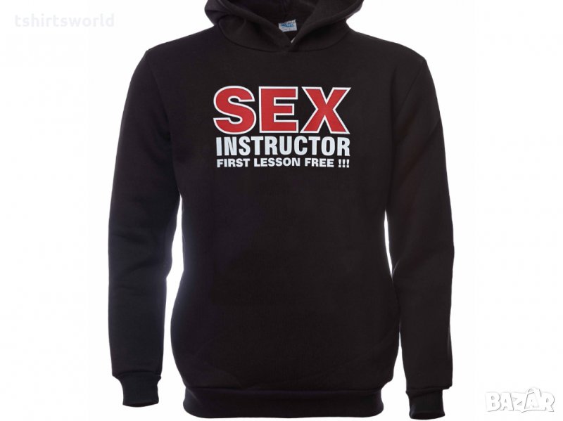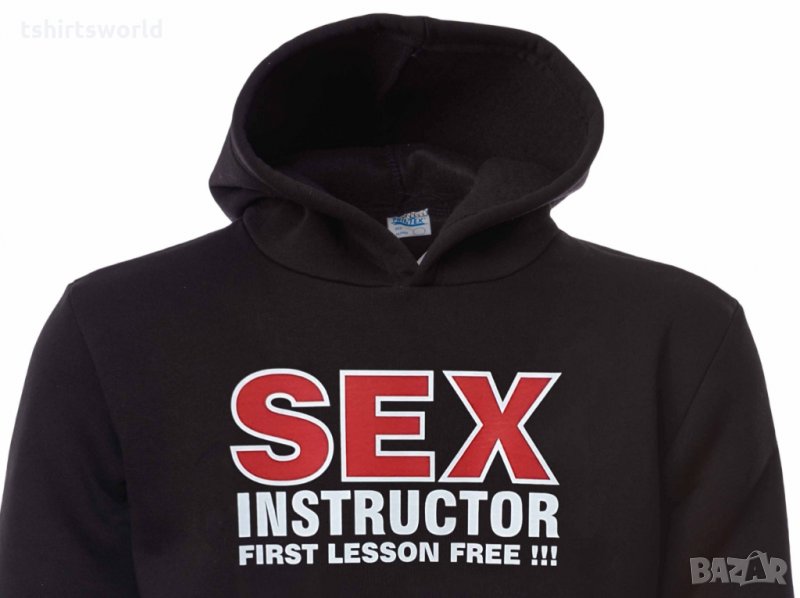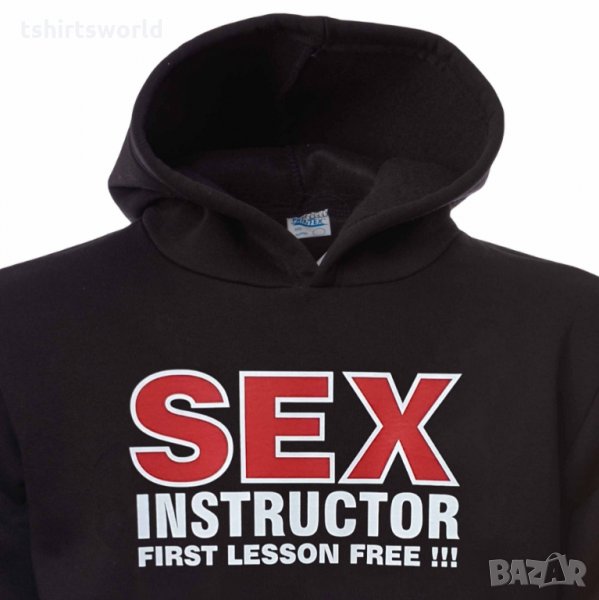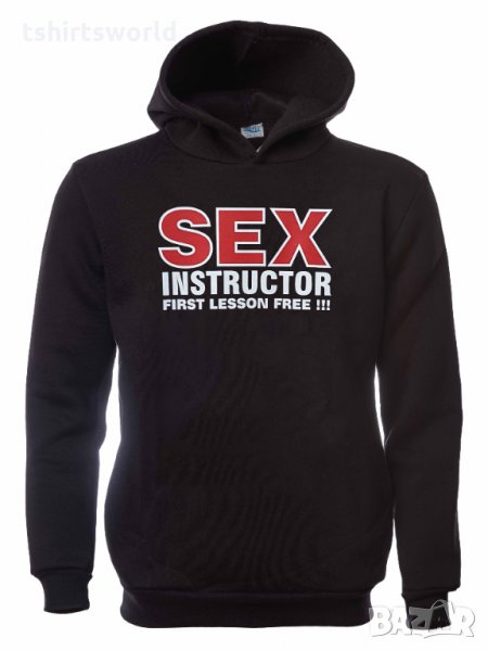 Страхотен нов черен мъжки суичър с качулка, две джобчета и трансферен печат SEX INSTRUCTOR first lesson free. Произведен в България под марката PRINTEX от висококачествен 100% памук - триконечна пенирана вата с кардировка, което го прави изключително топъл и желан от нашите дългогодишни клиенти. Моделът е подходящ за пролетния и есенно-зимният сезон, има ластични маншети на китките и ханша, запазващи топлината. Разполага с мека подплата и два отворени джоба в страни. Свободната кройка го прави подходящ както за спорт, така и за ежедневно носене с дънкови панталони. Марката PRINTEX от години се слави със своите топли и качествени суичъри.