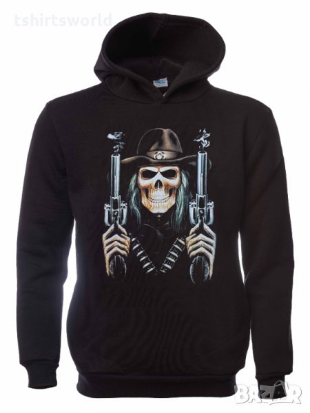 Страхотен нов черен мъжки суичър с качулка, две джобчета и дигитален печат Череп с пистолети. Произведен в България под марката PRINTEX от висококачествен 100% памук - триконечна пенирана вата с кардировка, което го прави изключително топъл и желан от нашите дългогодишни клиенти. Моделът е подходящ за пролетния и есенно-зимният сезон, има ластични маншети на китките и ханша, запазващи топлината. Разполага с мека подплата и два отворени джоба в страни. Свободната кройка го прави подходящ както за спорт, така и за ежедневно носене с дънкови панталони. Марката PRINTEX от години се слави със своите топли и качествени суичъри.